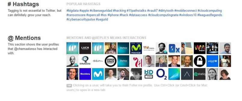 Si ponemos el puntero encima de la foto del perfil podemos ver quiénes son los usuarios que más veces “mencionan” en los tuits. Esta es una buena forma de encontrar influencers dentro del sector que vamos a monitorizar.